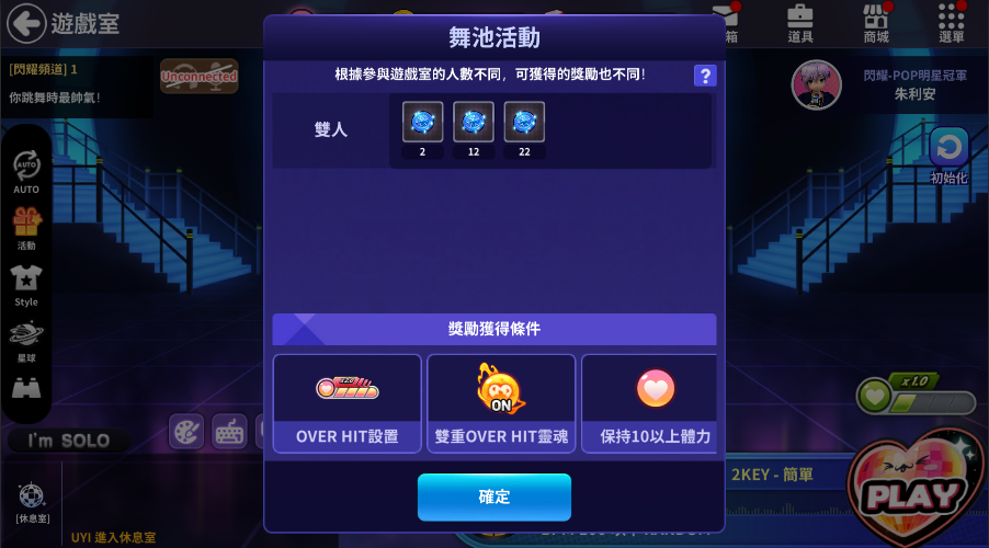 遊戲模式 | 人數 | BPM | 加助器 | OVER HIT | Double OVER HIT Soul | Min 等級 | Max 等級 | 最少體力 | Min 明星等級 | Max 明星等級 |