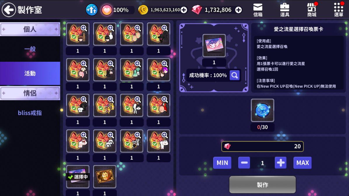 愛之流星選擇召喚票卡 | 30個 | 100% |