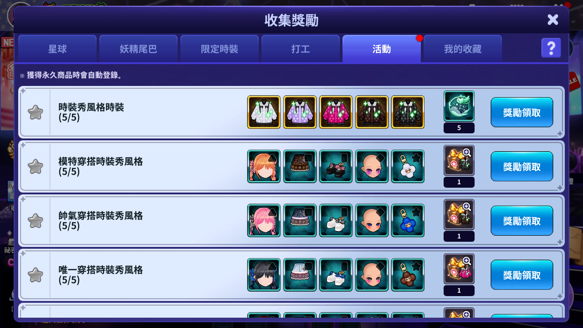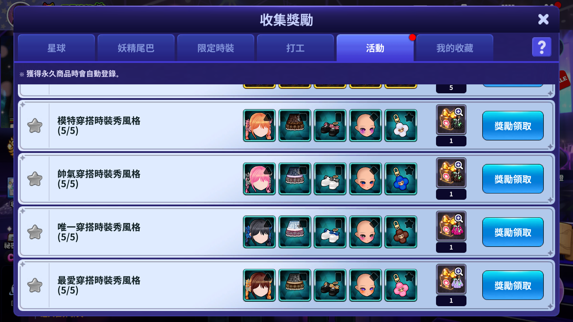 - 獲得符合每個收集獎勵的時裝,當符合條件時,就可以獲得收集獎勵。