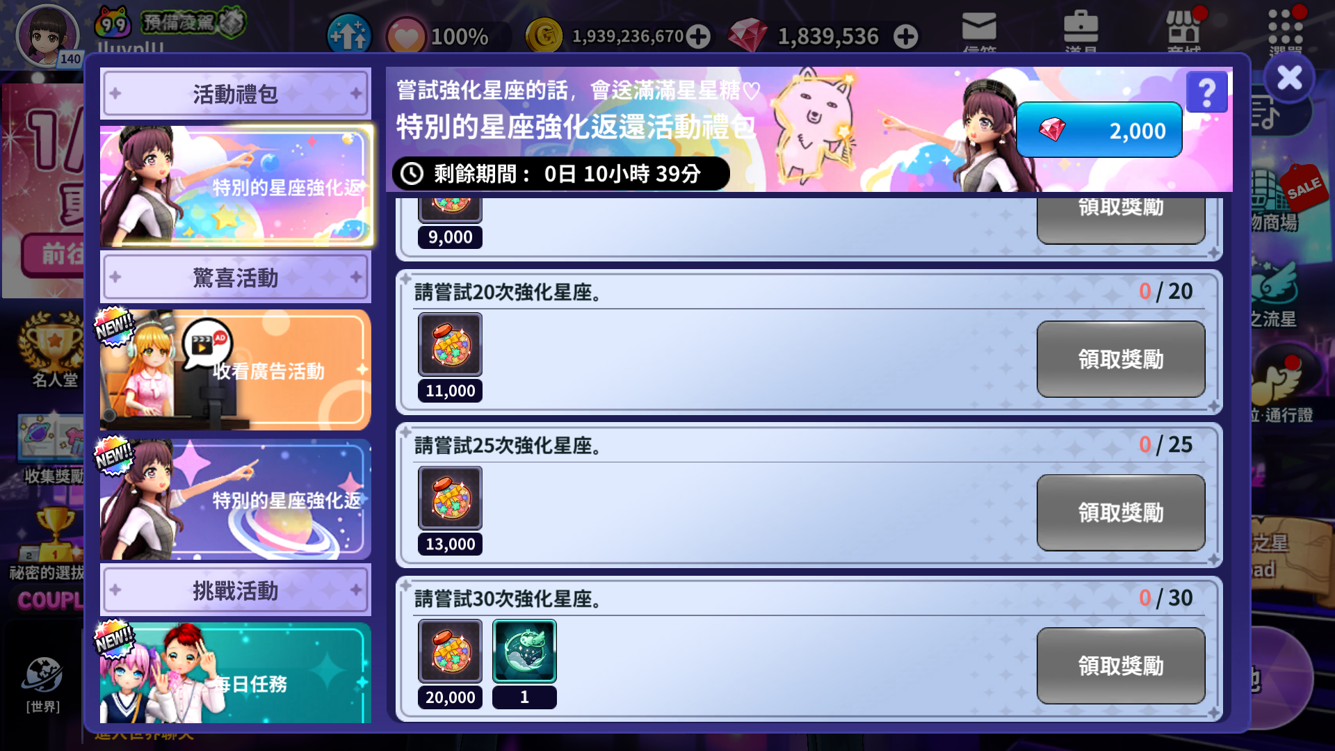 - 嘗試強化星座,達成目標任務次數時可以獲得獎勵。
