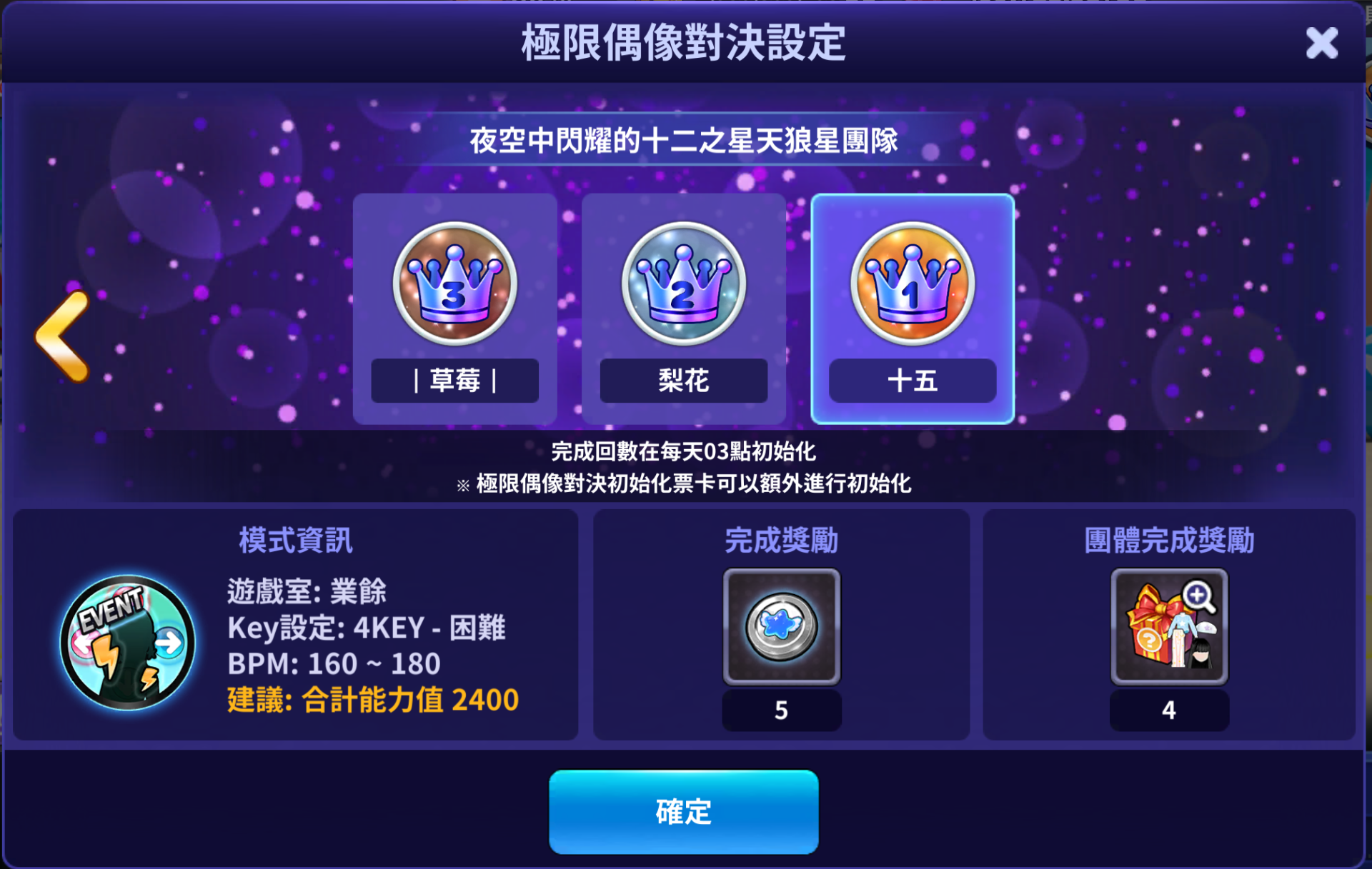 3 | 十五 | 4key_hard | 160~180 | 撲通撲通閃耀偶像硬幣 | 5 |