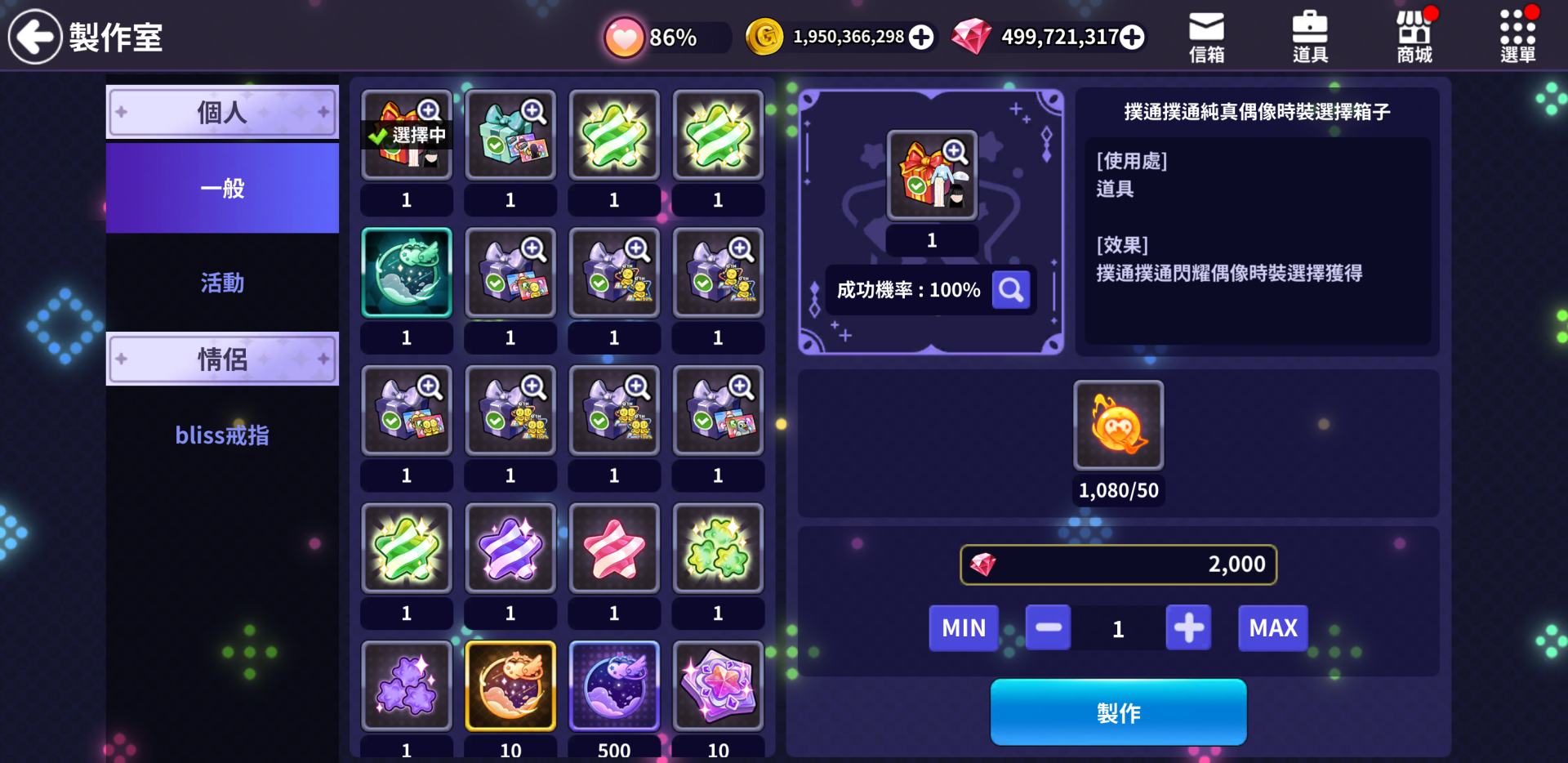 1 | 極限偶像對決初始化票卡選擇箱子 1個 | 名人幣 500個 紅水晶 20個 | 100% |