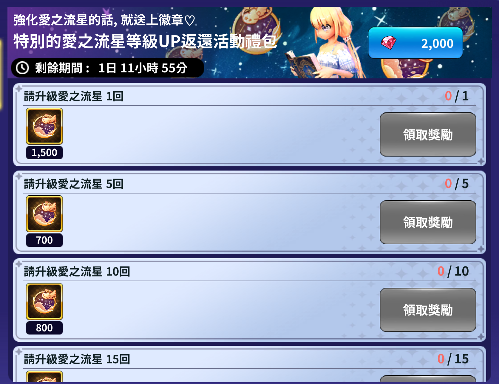 - 活動期間嘗試強化愛之流星,達成目標任務次數時可獲得獎勵。
