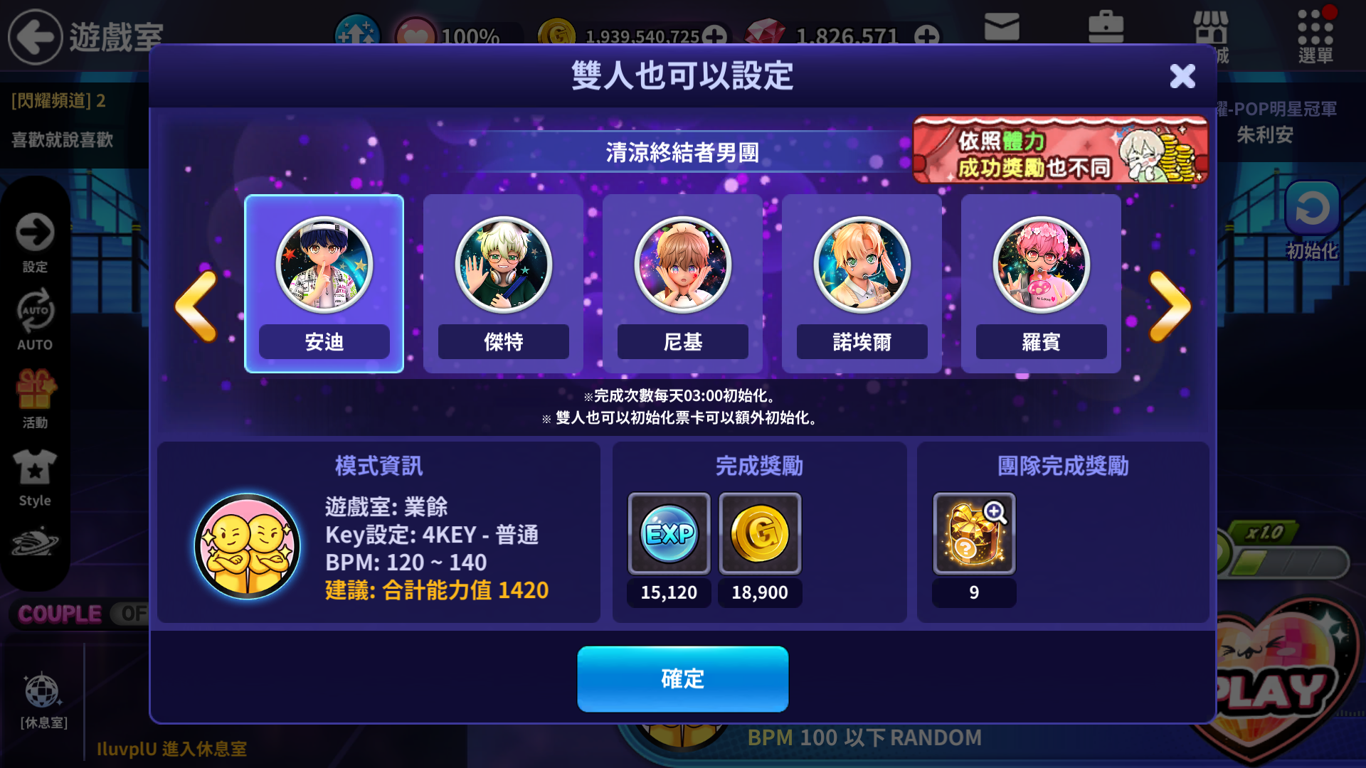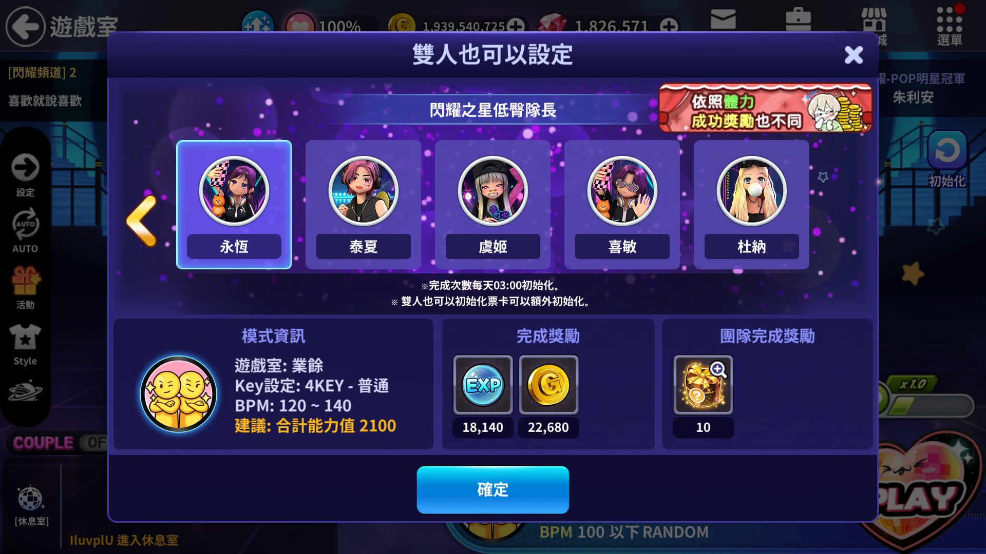 模式 | 團隊名 | 推薦能力值 | 團隊 NPC | EXP獎勵 | 金幣獎勵 | 需要初始化票卡張數 |