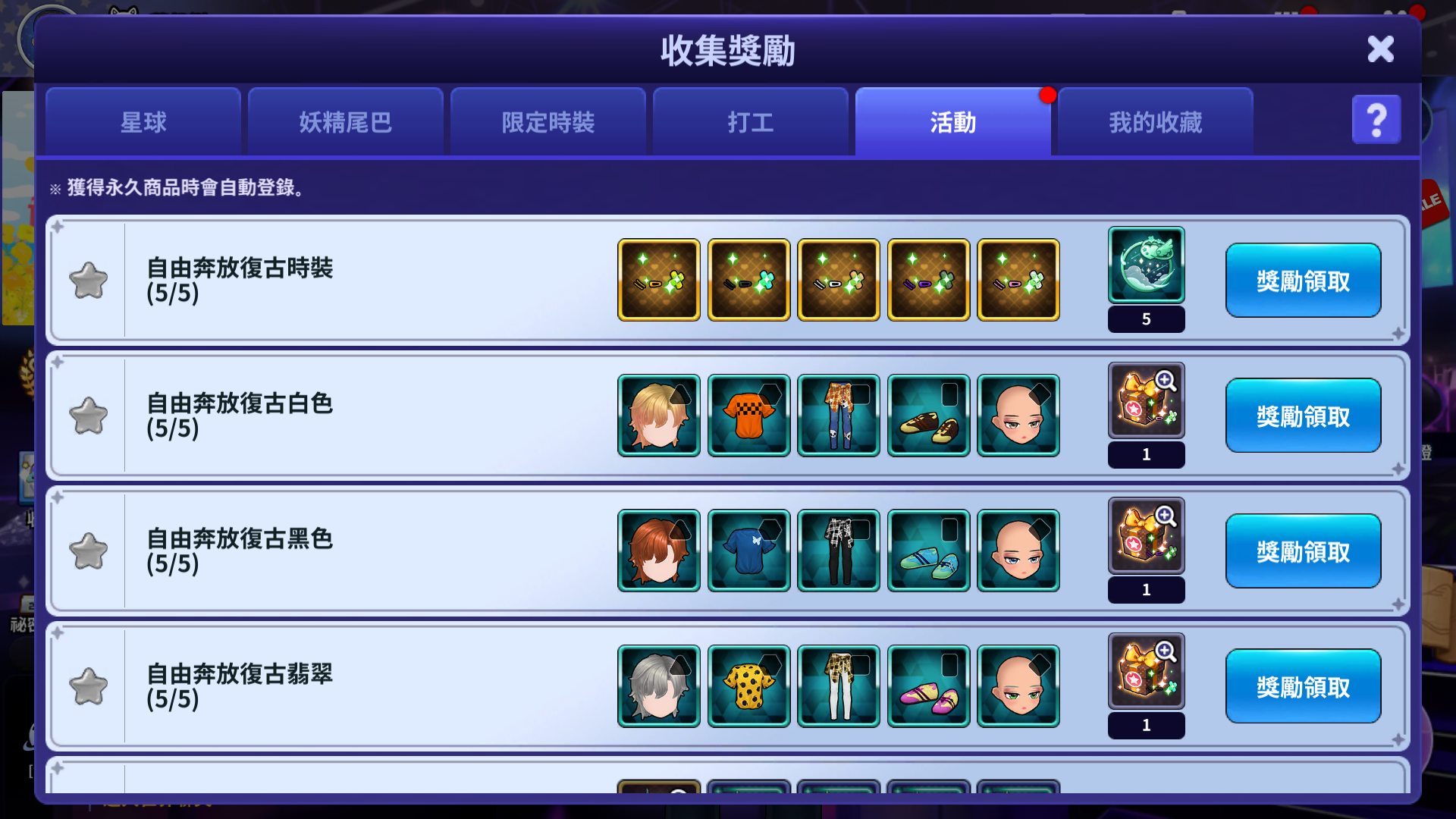 - 獲得符合每個收集獎勵的時裝,當符合條件時,就可以獲得收集獎勵。