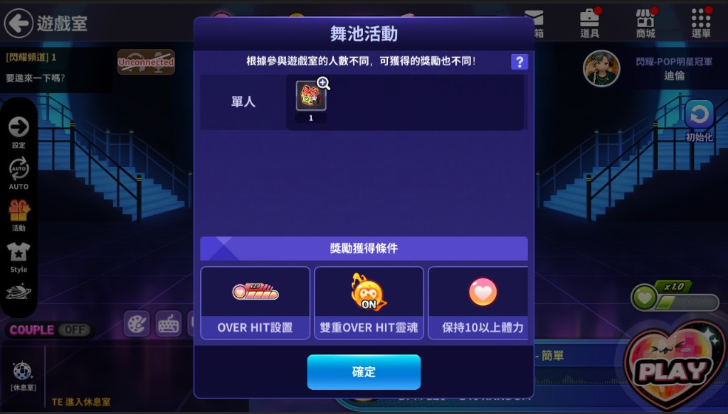 遊戲模式 | 人數 | BPM | 加助器 | OVER HIT | Double OVER HIT Soul | 最少體力 | Min 明星等級 | Max 明星等級 |