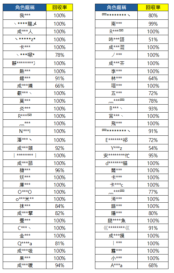 在此決定公開這次使用不正當獲得獎勵的玩家名單及目前回收進度。