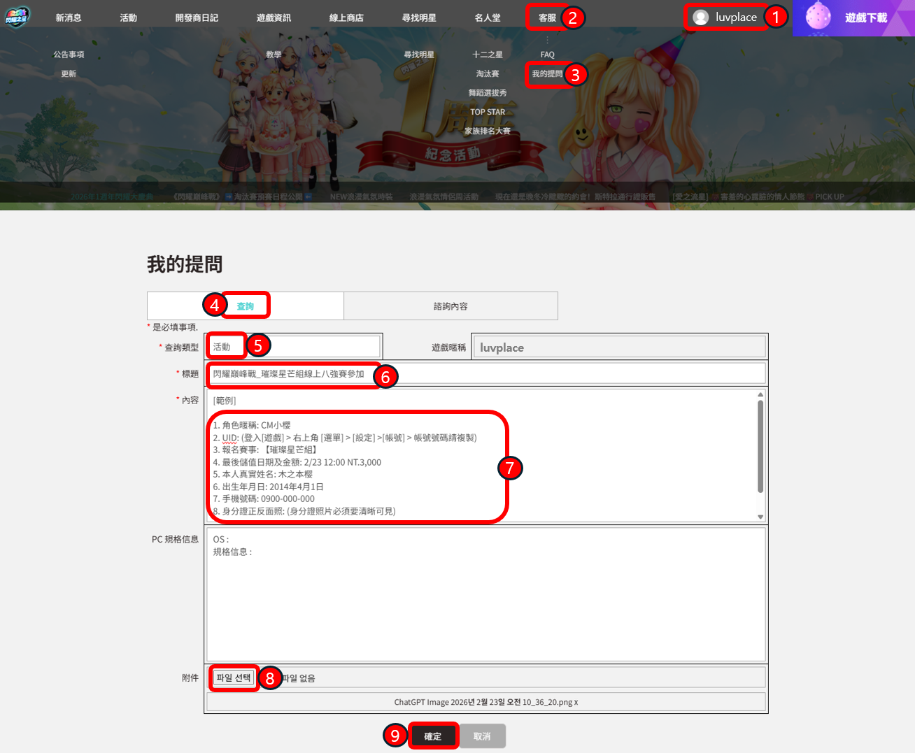 2. UID: (登入[遊戲] > 右上角 [選單] > [設定] >[帳號] > 帳號號碼請複製)