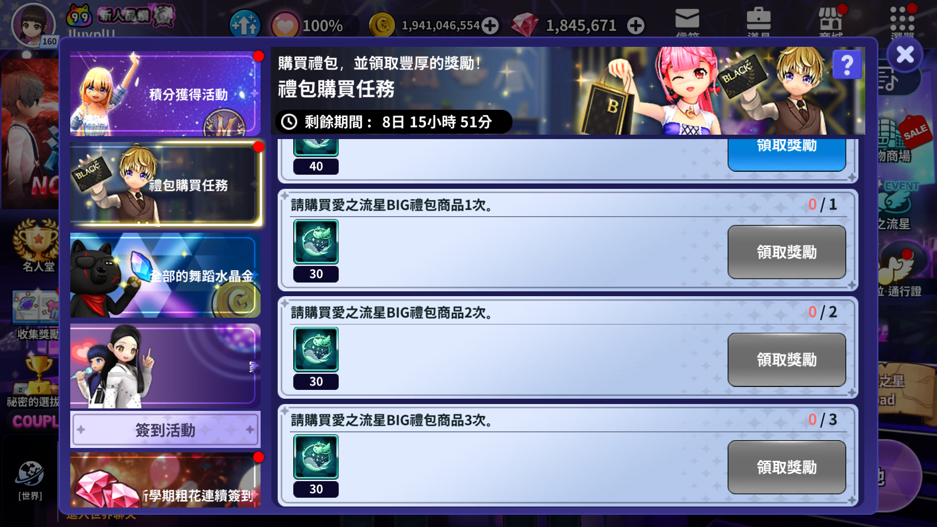 - [主畫面] - [活動] - 可以在[禮包購買任務] 標籤上確認