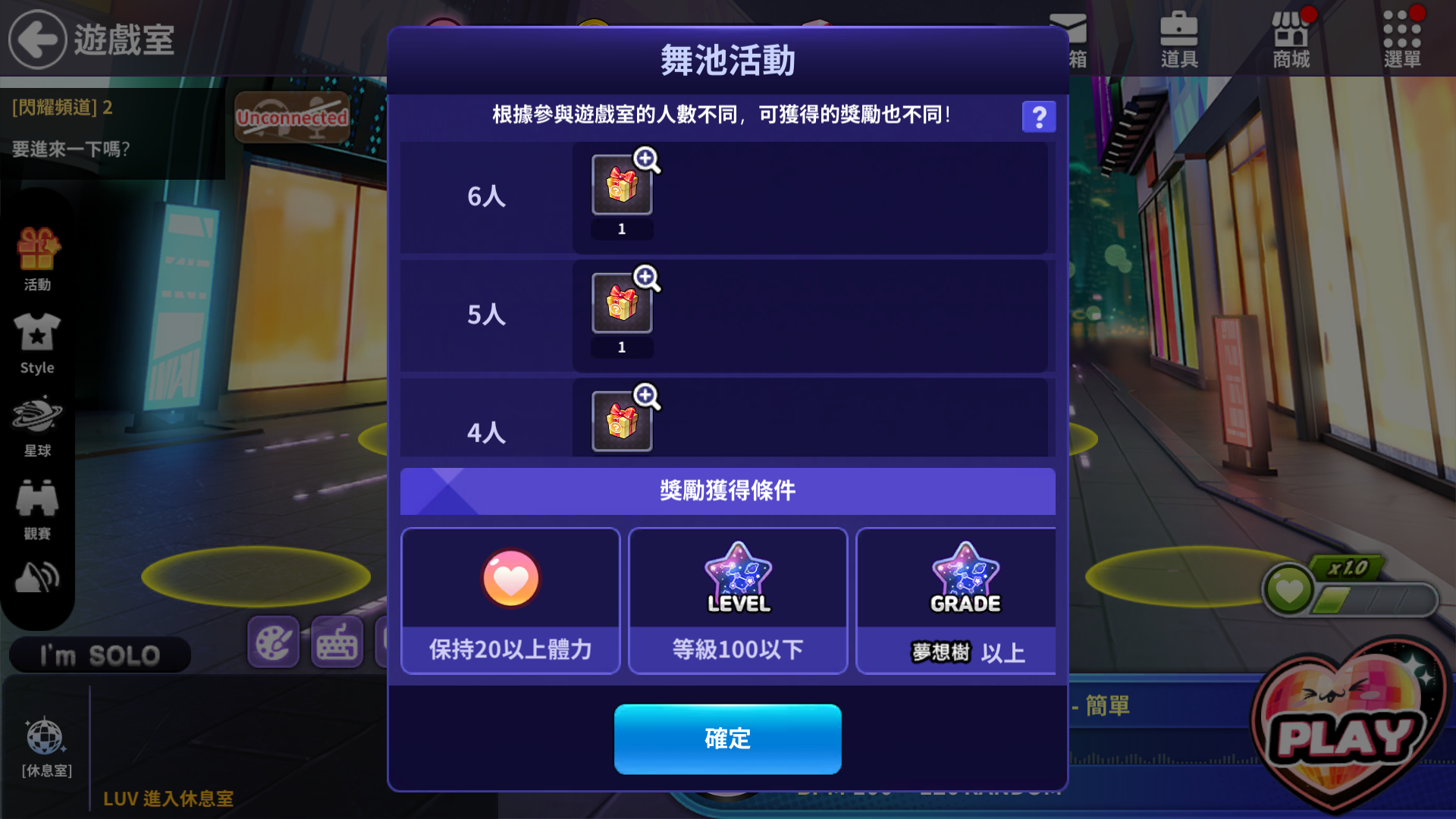 - 為了獲得舞池活動獎勵,需要達到條件。