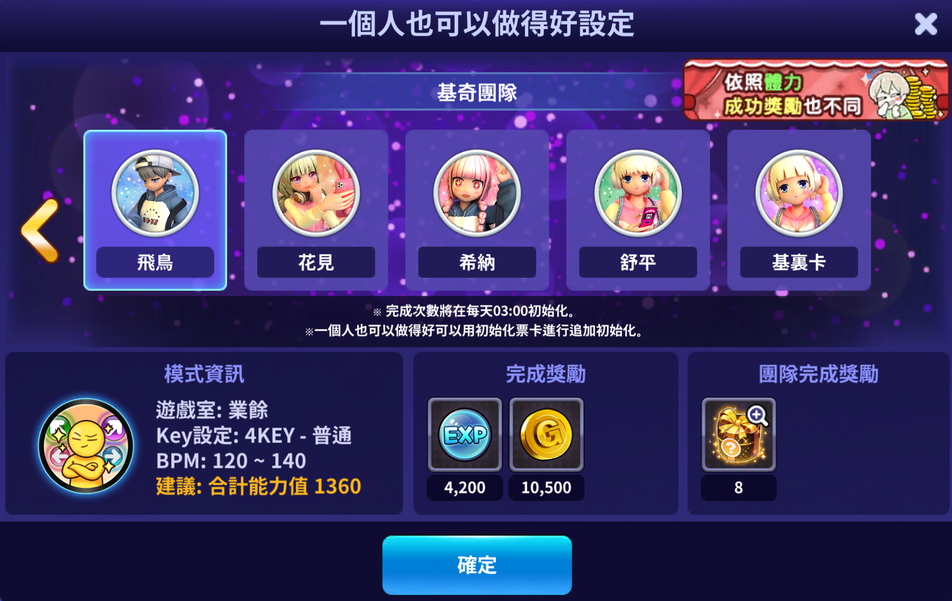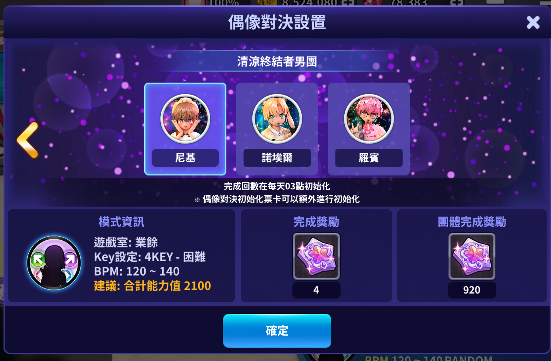 - 完成偶像對決就可以獲得團體完成獎勵2倍獎勵。