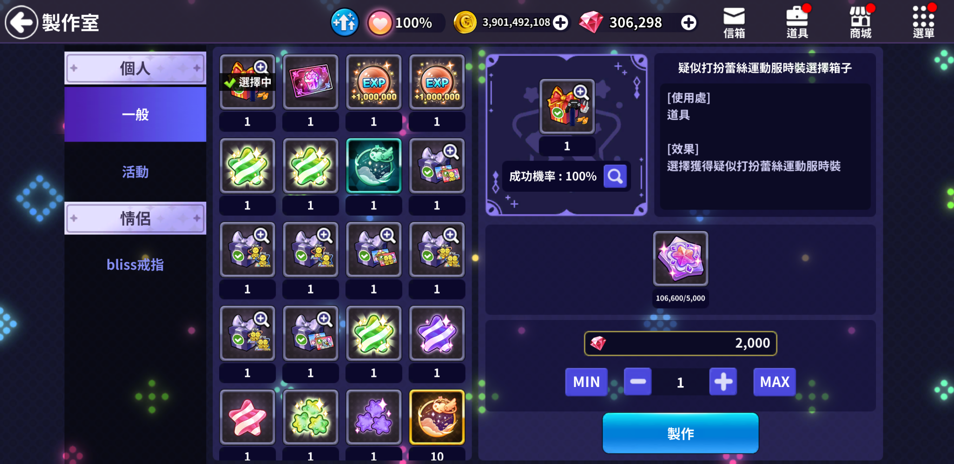 1 | 疑似打扮蕾絲運動服時裝選擇箱子 1個 | 名人幣 5,000個 紅水晶 2,000個 | 100% | - |