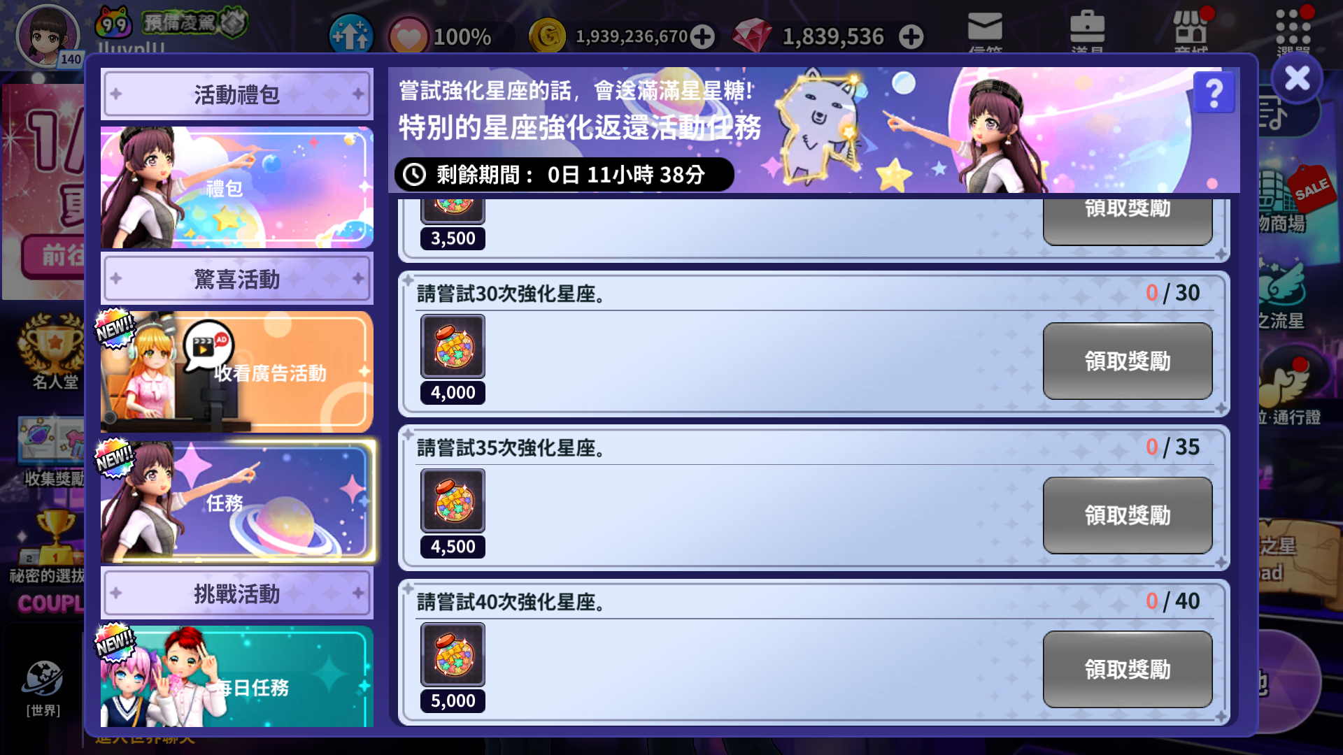 - 嘗試強化星座,達成目標任務次數時可以獲得獎勵。