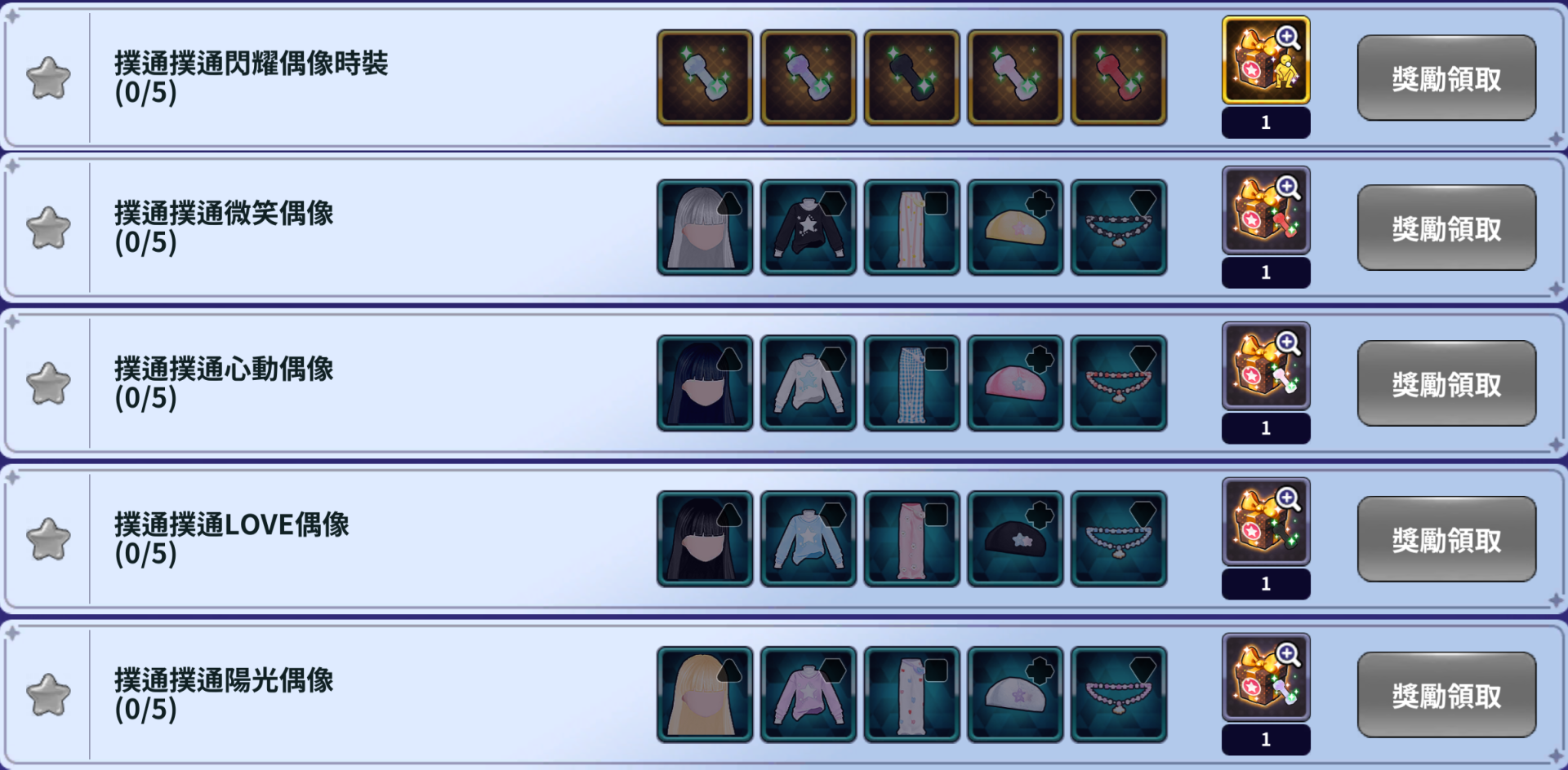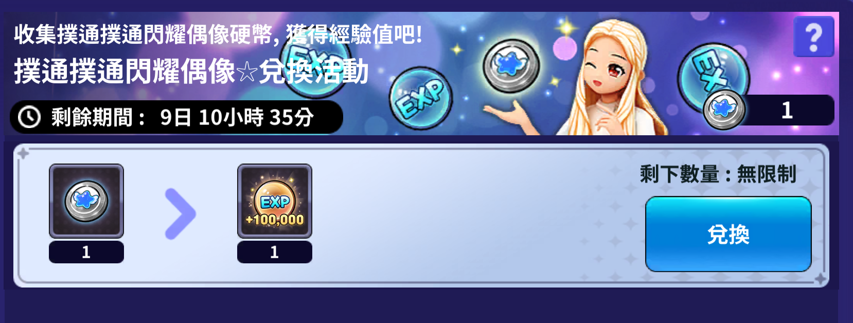 1 | EXP 100,000 | 1 | 撲通撲通閃耀偶像硬幣 | 1 | 無限次 |