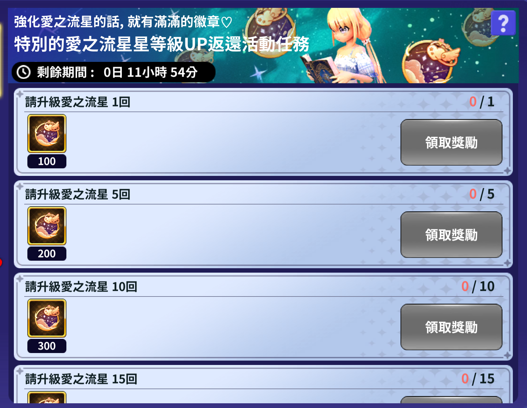 - 活動期間嘗試強化愛之流星,達成目標任務次數時可獲得獎勵。