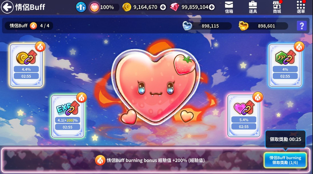 - [主畫面] - [情侶] - [情侶] - [情侶 Buff] - [情侶burning Buff] 確認。