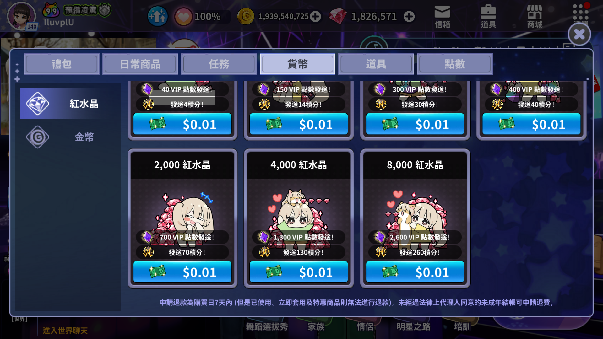 付費禮包 (紅水晶: 2,000) | ||||