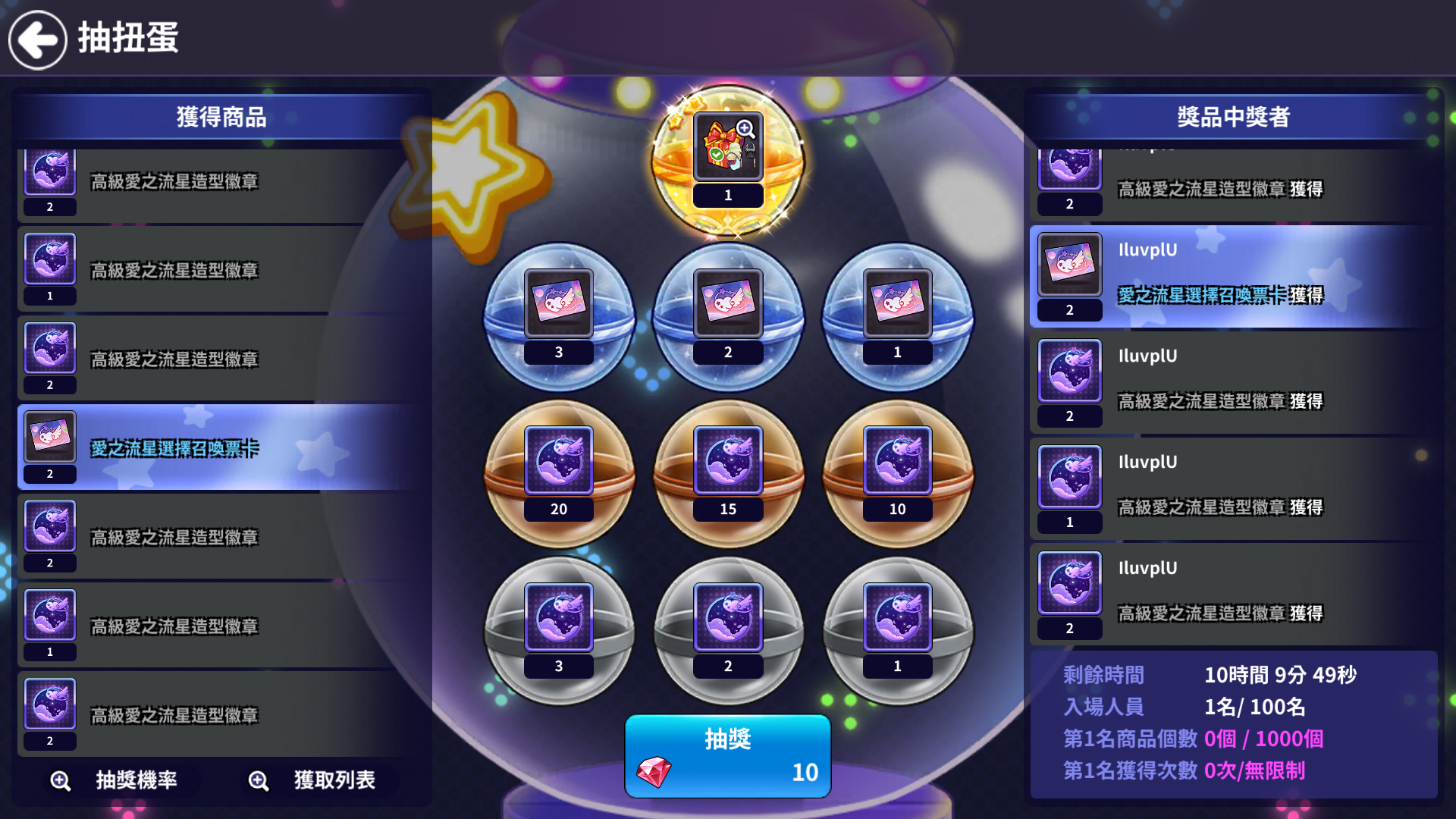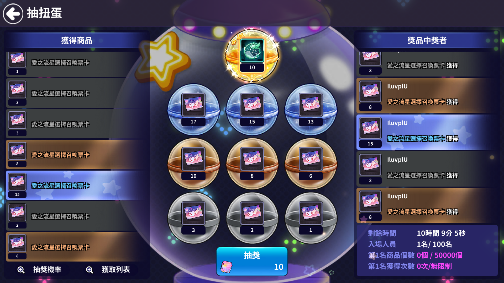 | 6號扭蛋 | 愛之流星選擇召喚票卡 10個 |