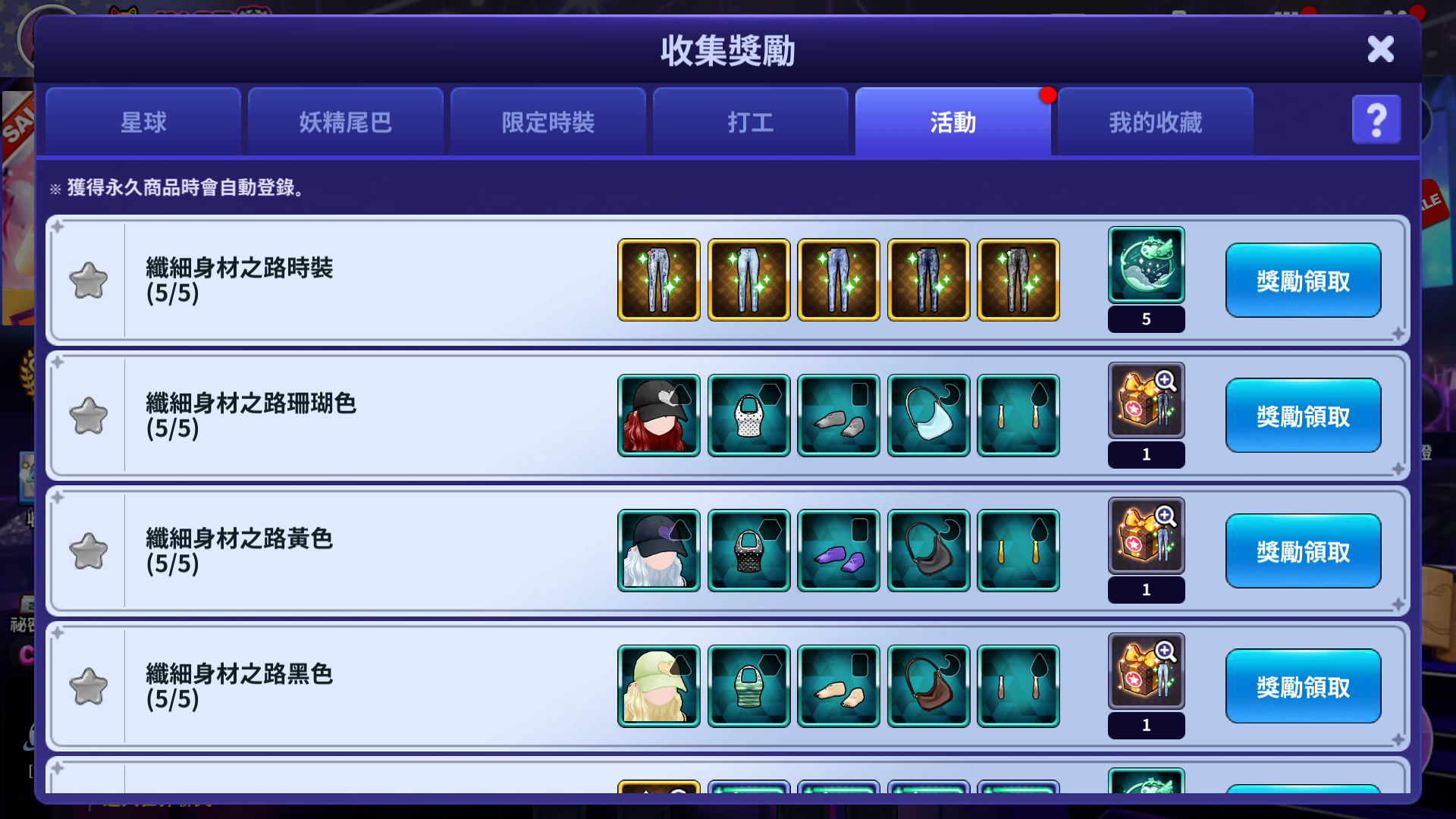 - 獲得符合每個收集獎勵的時裝,當符合條件時,就可以獲得收集獎勵。