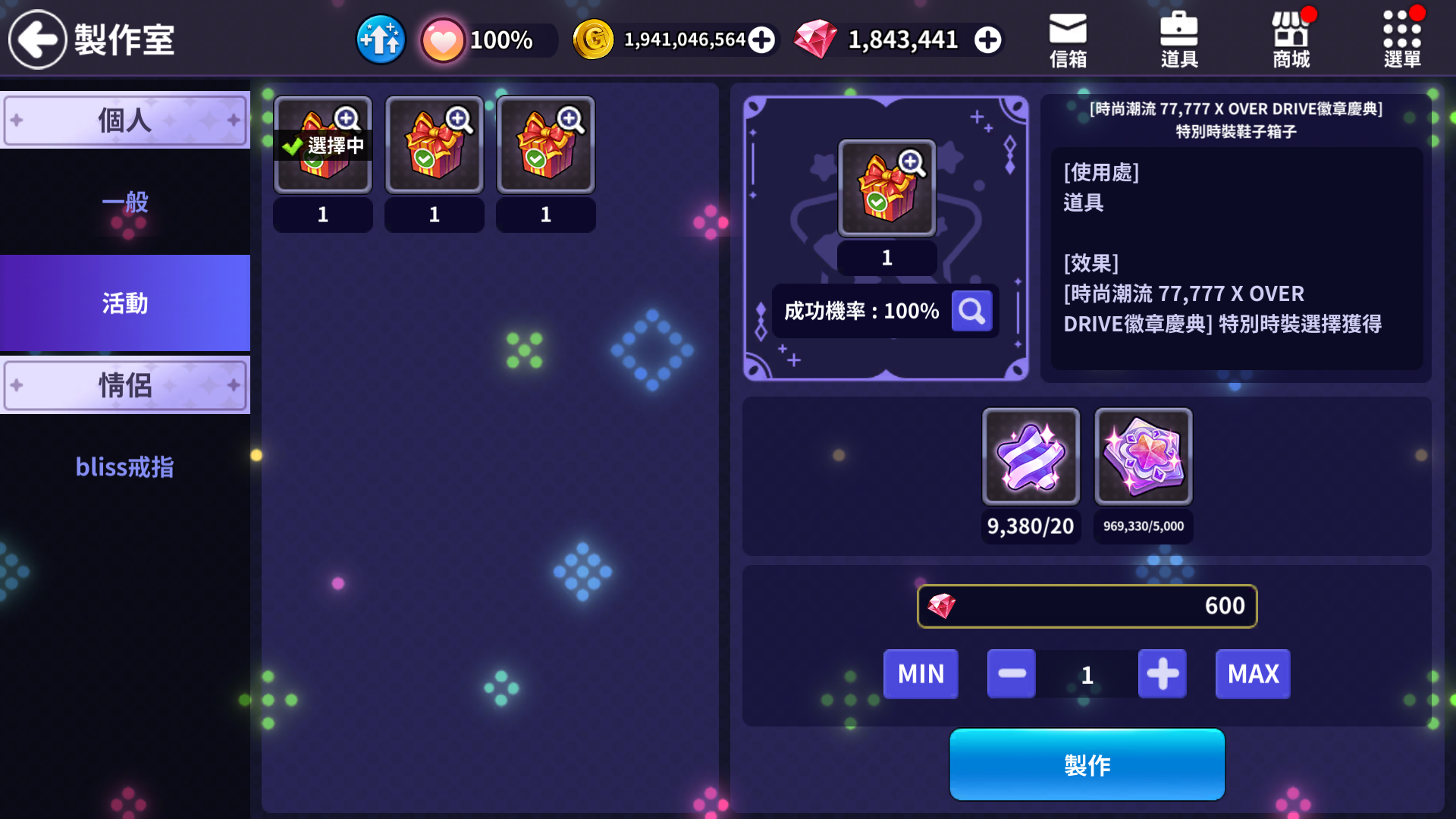 鞋子 | [時尚潮流 77,777 X OVER DRIVE徽章慶典] 特別時裝鞋子箱子 | 1 | 20 | 5000 | 600 | 100% |