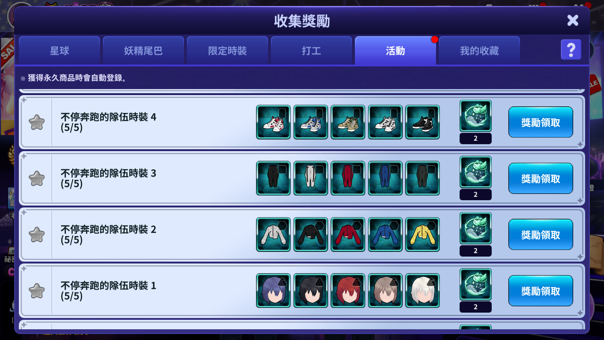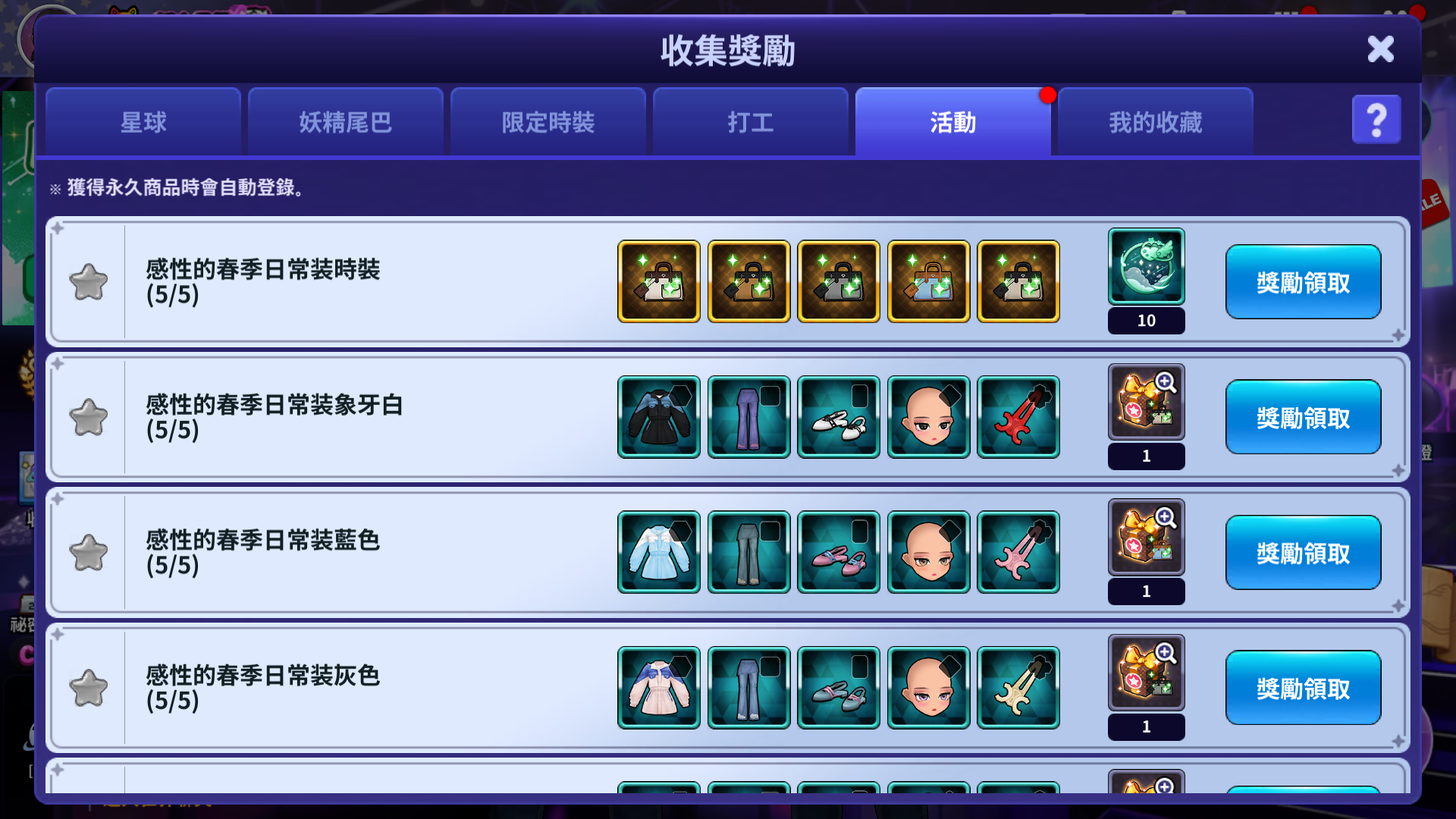 - 獲得符合每個收集獎勵的時裝,當符合條件時,就可以獲得收集獎勵。