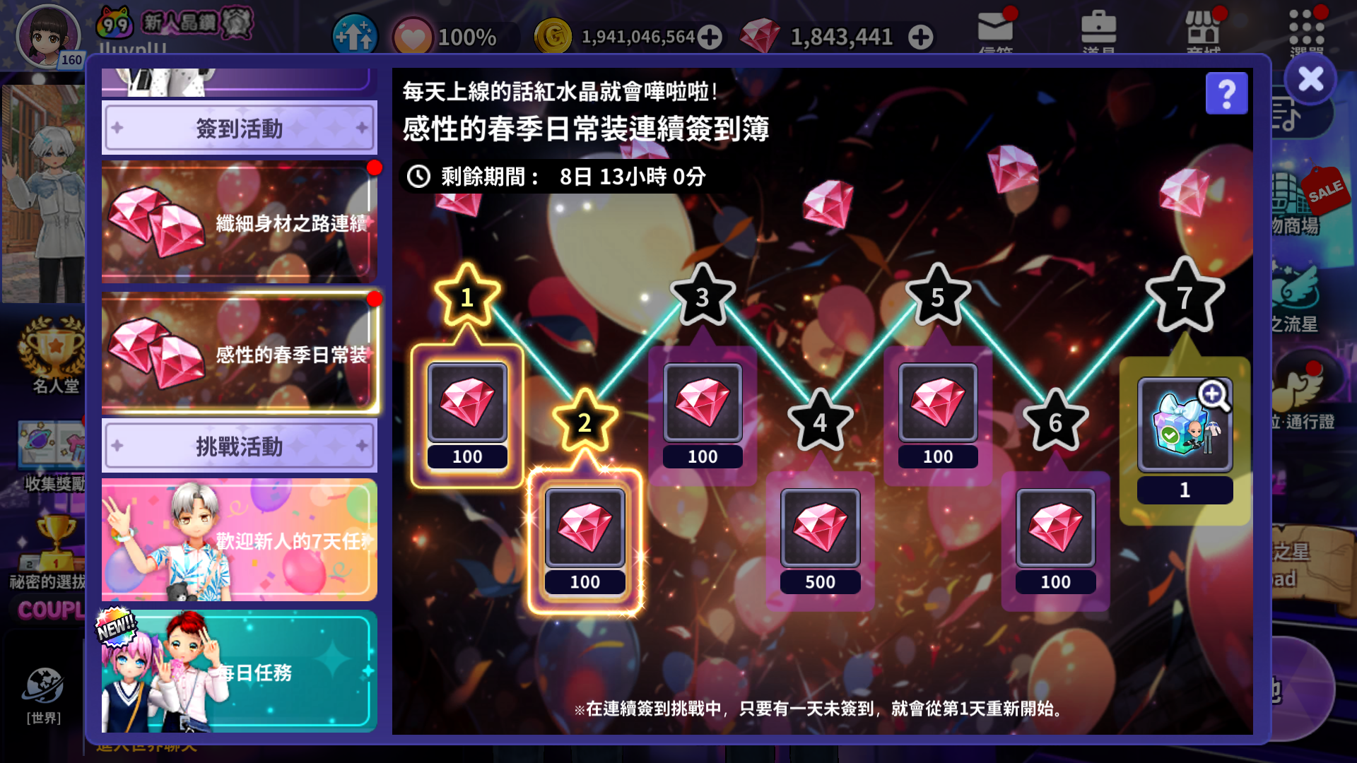 - 連續簽到時可以獲得下一次簽到獎勵。