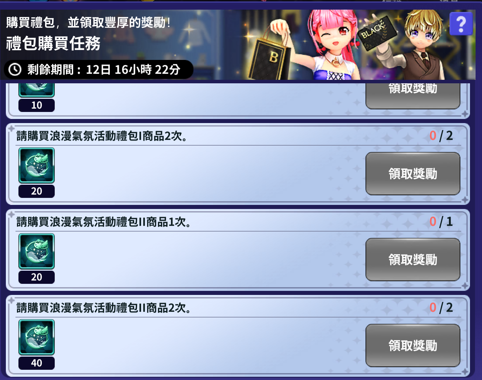 - [主畫面] - [活動] - 可以在[禮包購買任務] 標籤上確認