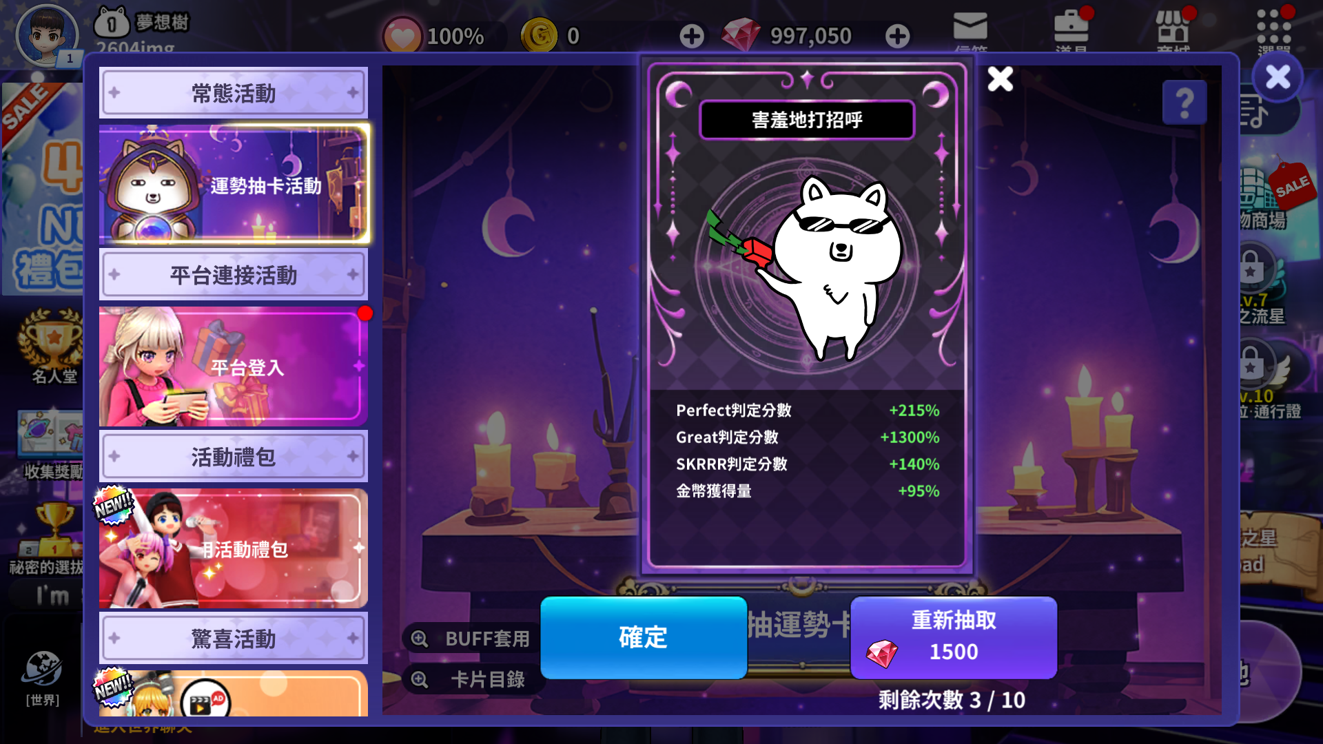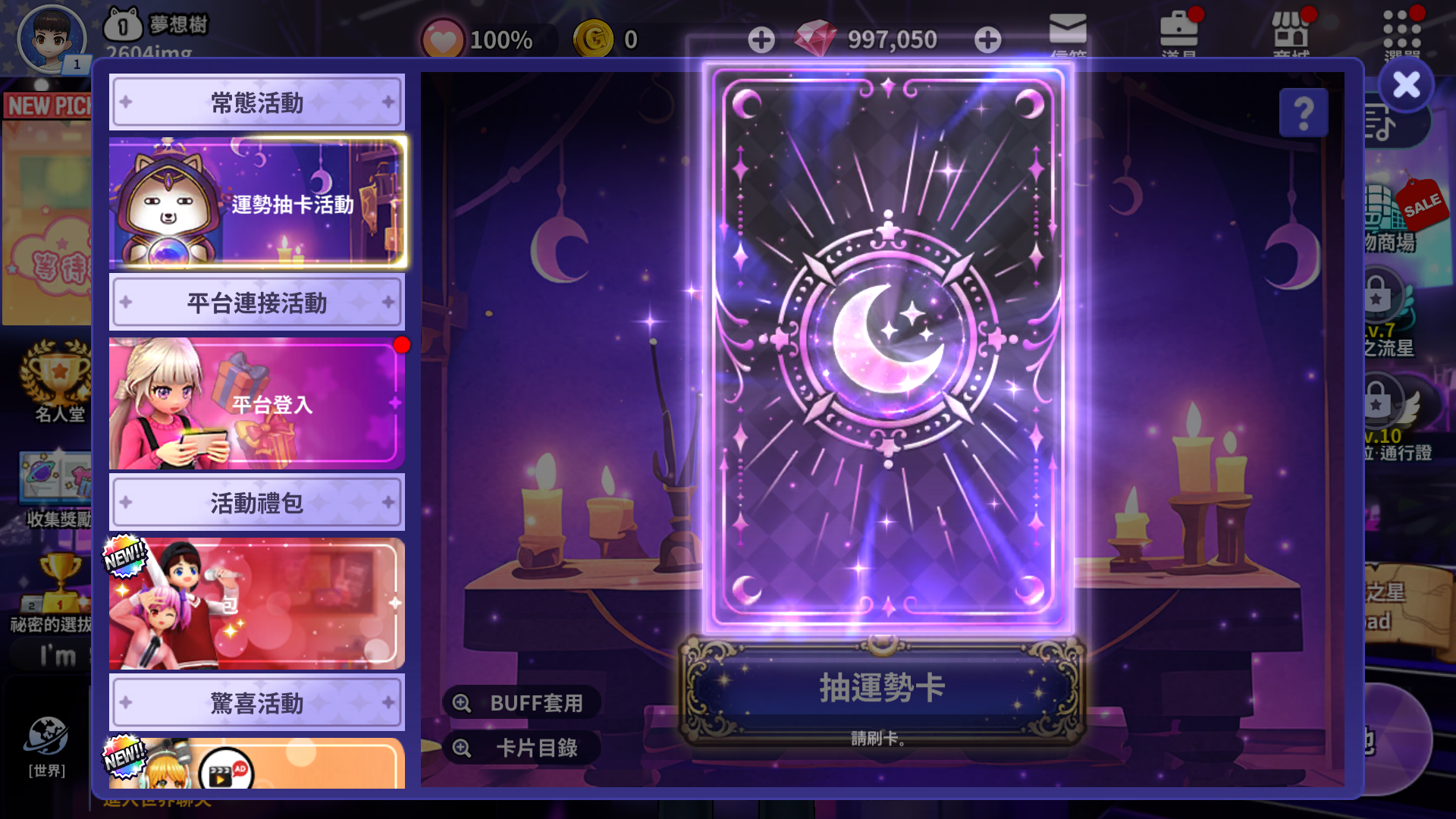 - "抽運勢卡"是抽到的卡在一定時間內套用BUFF的內容。