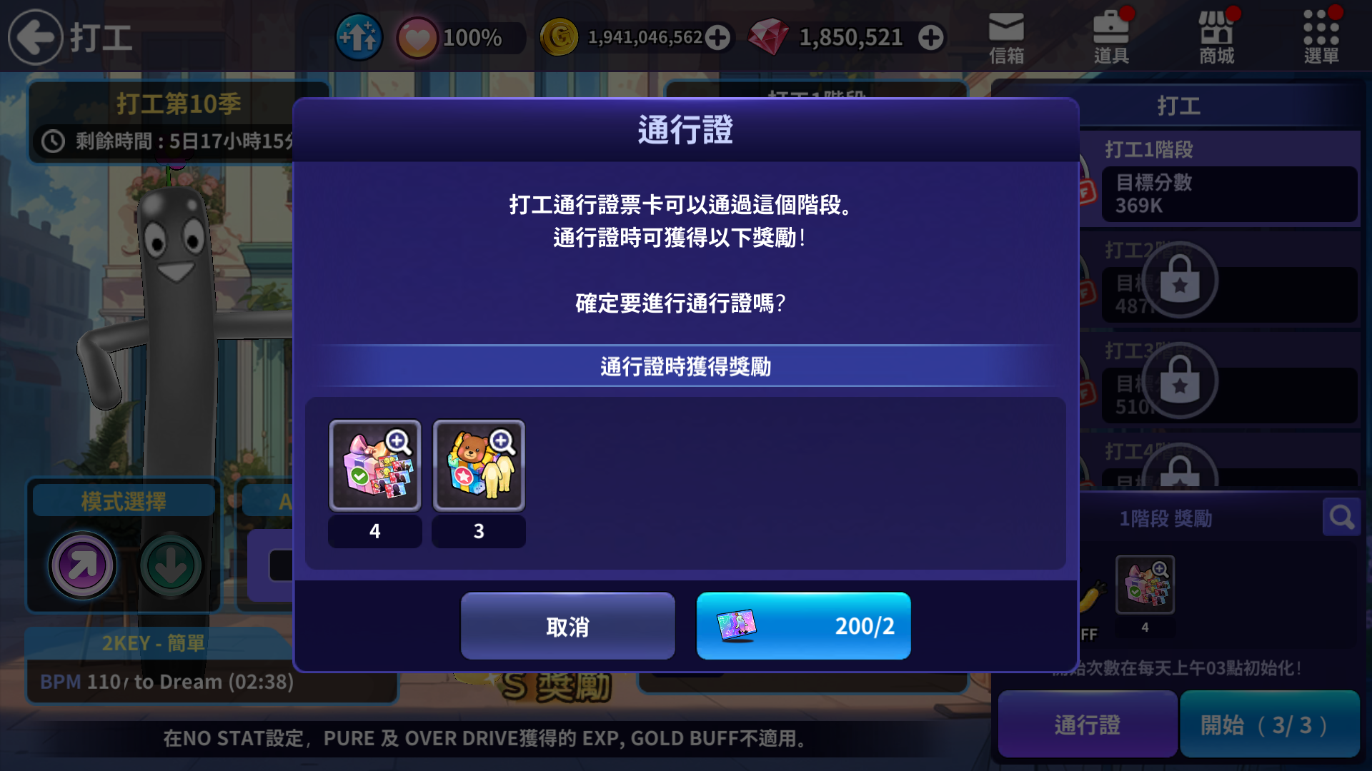 - 已經進行中的關卡也可以使用打工通行證票卡 .。