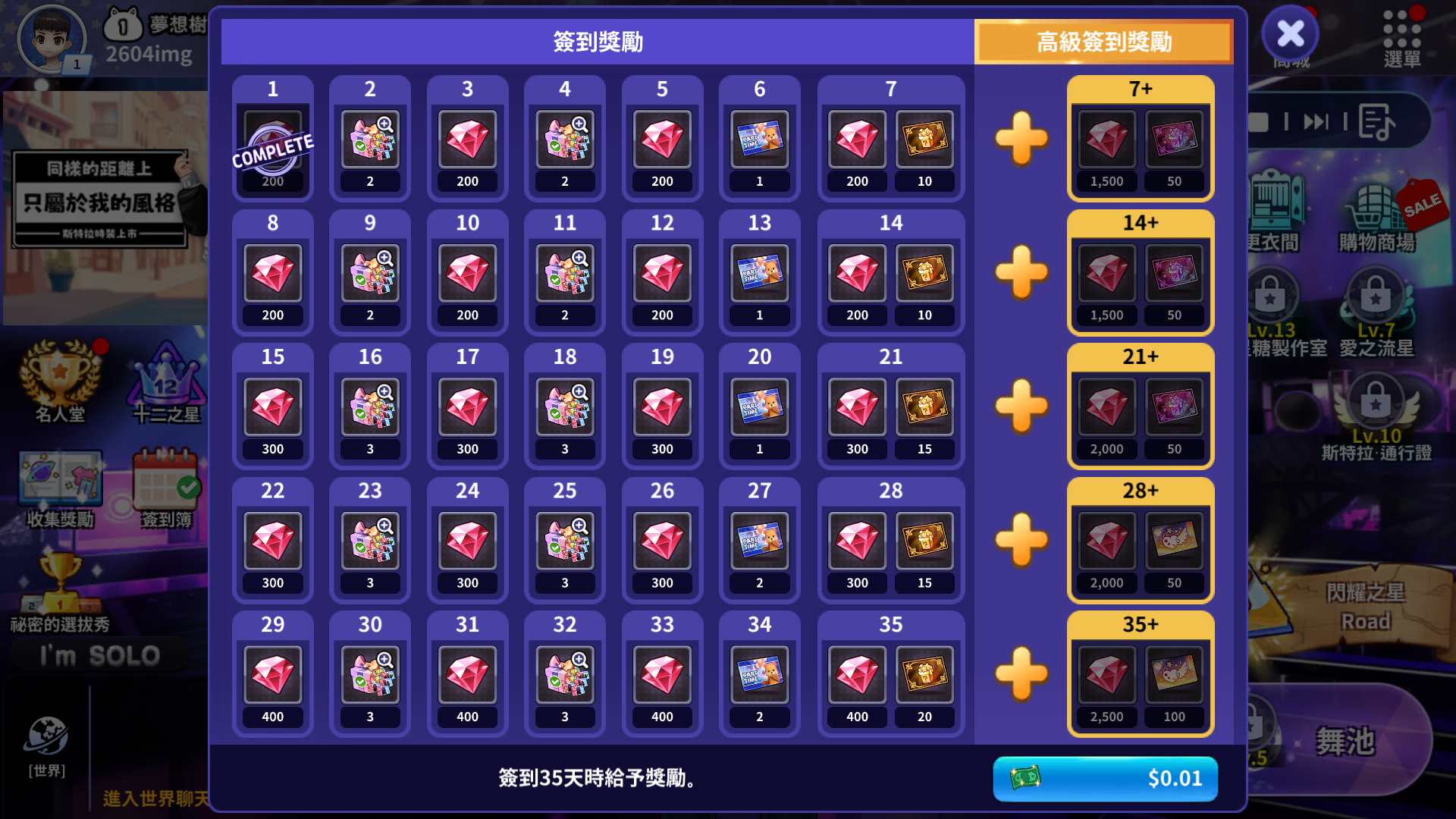 - 購買高級簽到獎勵時,在第7天、14天、21天、28天、35天登錄,將獲得額外獎勵。