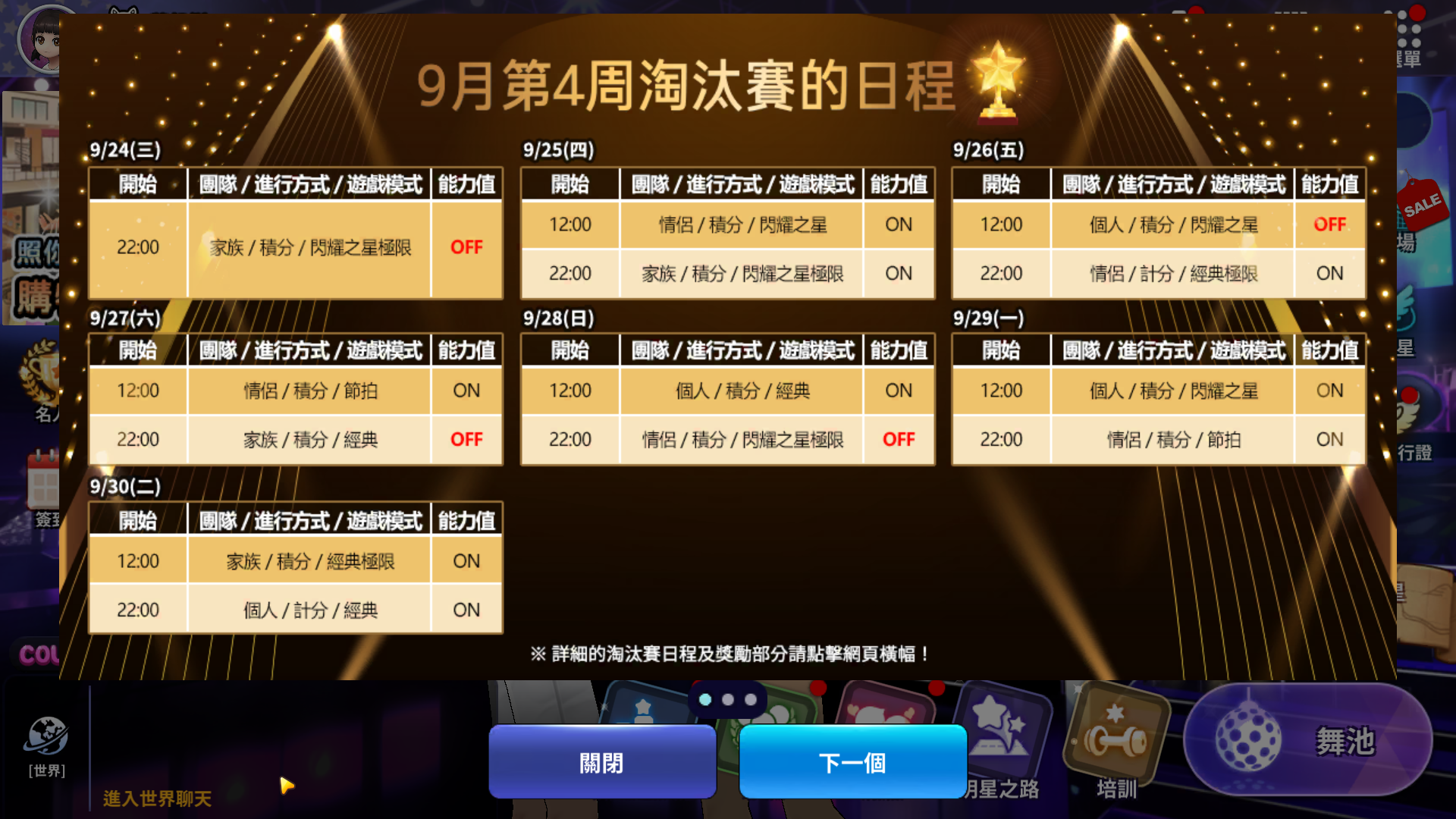 📌舞池遊戲室內現在進行中的秘密選拔秀任務條件,新增了可以立即進行遊戲設定的變更按鈕。