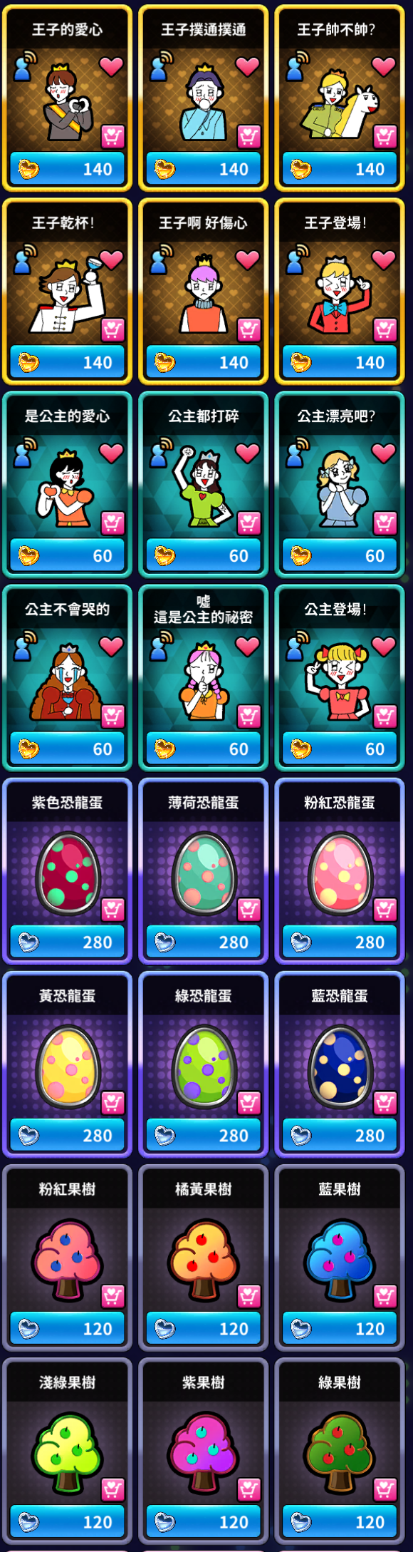 | 呼吸清晨空氣的偶像 | 銀色情侶硬幣 1個 | 銀色情侶硬幣 20個 | 銀色情侶硬幣 20個 | 黃金情侶硬幣 36個 | |