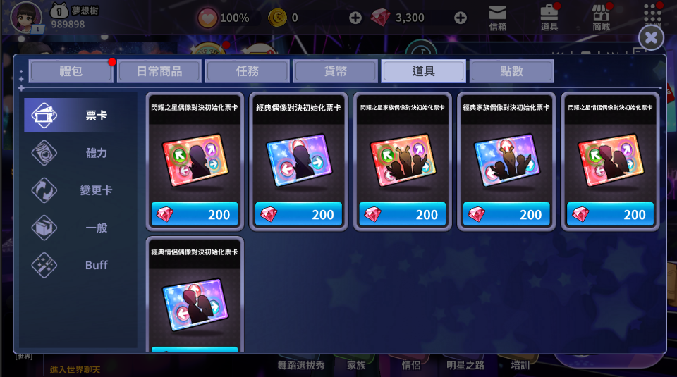 📌在[商城] - [道具] - [票卡]新增個人, 家族, 情侶偶像對決初始化票卡商品。(價格: 200 紅水晶 / 無限制)