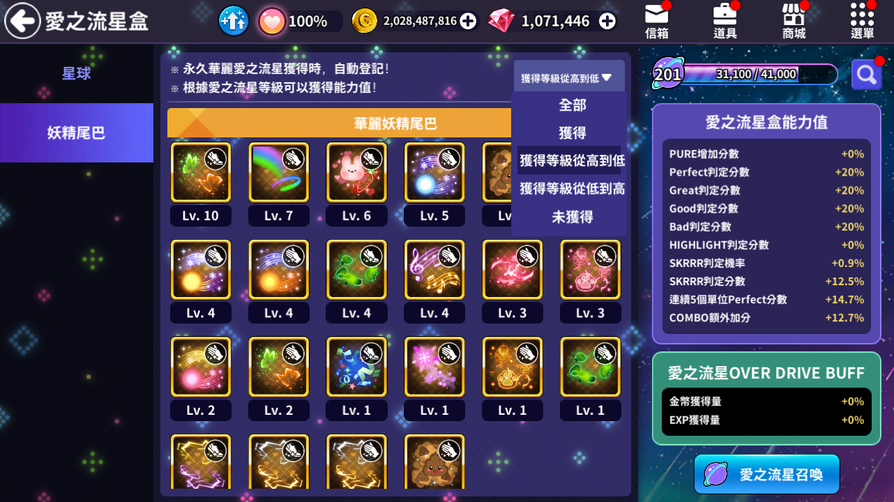📌愛之流星盒中登記的愛之流星, 新增了可以按照獲得等級順序作排序的按鈕。