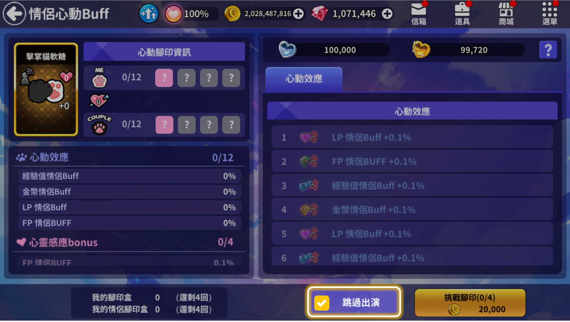 📌情侶心動buff畫面下端增加了可以跳過腳印演出的按鈕UI。