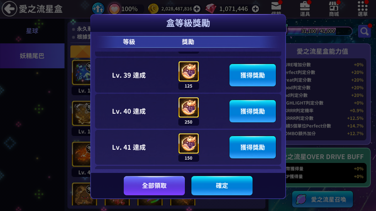 📌愛之流星盒等級獎勵彈窗下端, 增加可一次性獲得獎勵的【全部領取】按鈕。